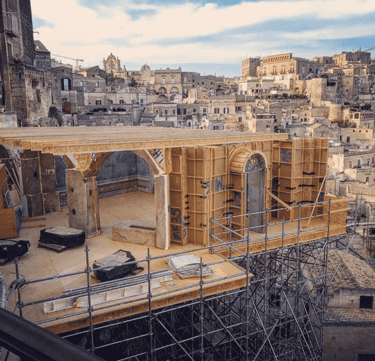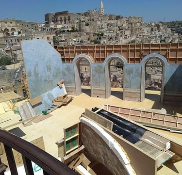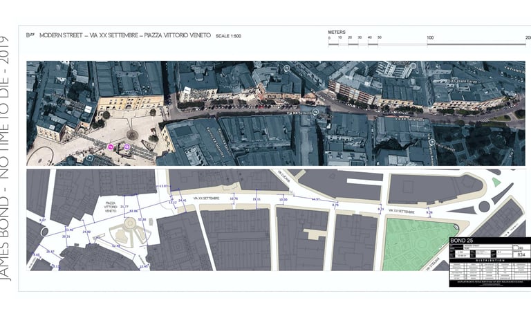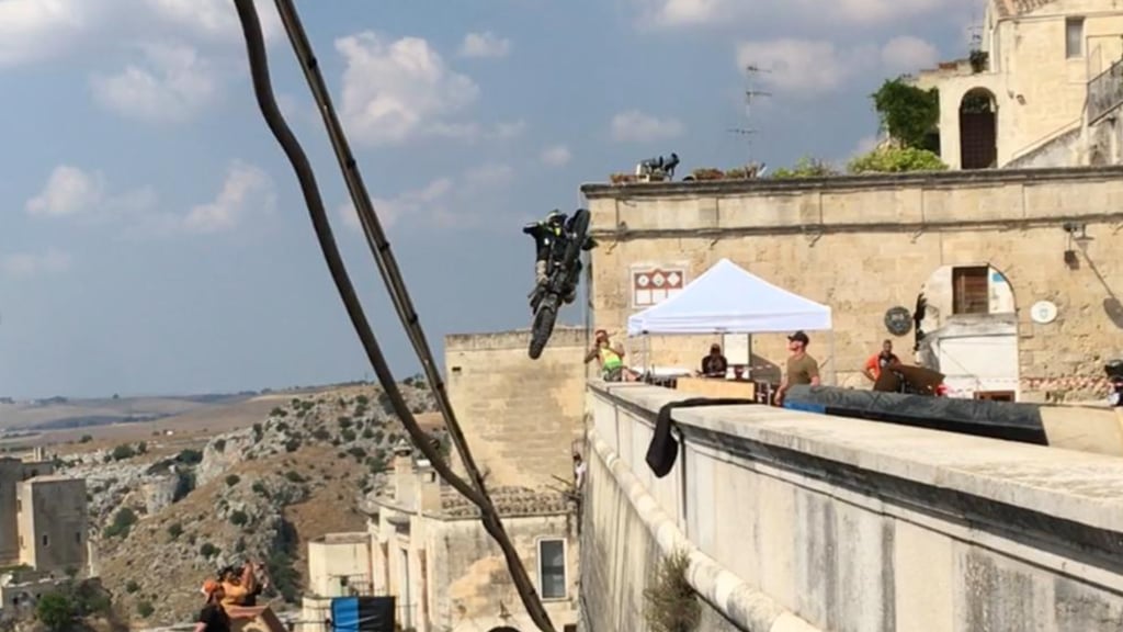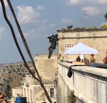 Matera was transformed into one of the most complex open-air sets in Bond history. Every door, window and architectural element in the city centre was replaced with scenographic versions. Ramps were built for motorcycle stunts. The streets of Matera were then reconstructed at 1:1 scale on an abandoned airstrip — sections up to five hundred metres long — so stunt drivers could rehearse every sequence before filming in the city itself.