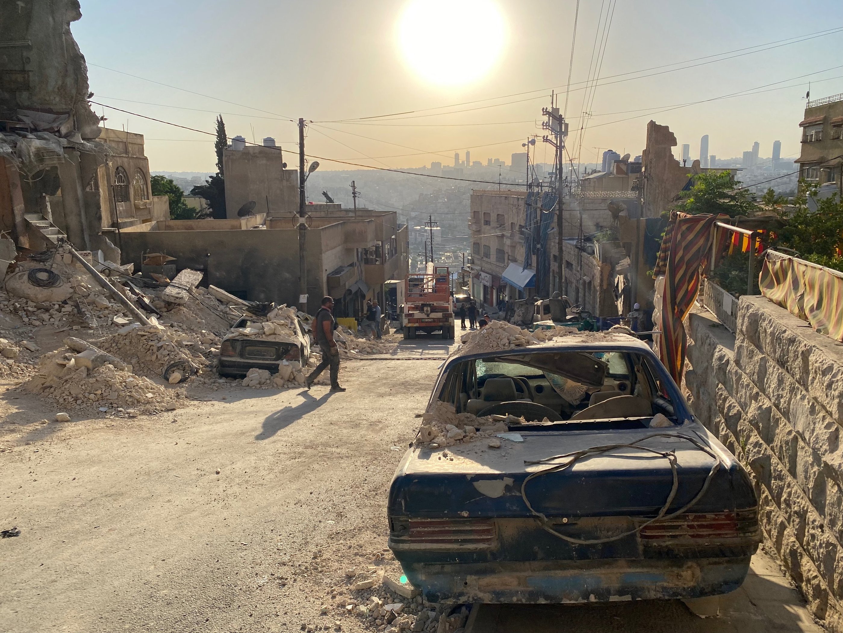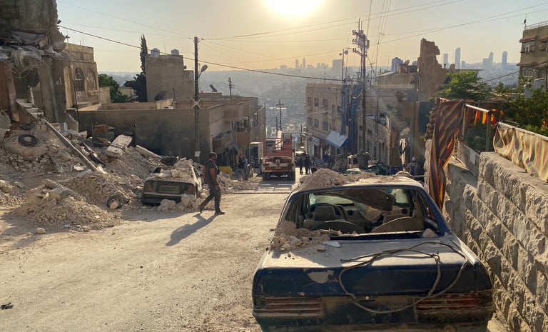 A residential building in central Amman was dismantled and entirely rebuilt on a new location — transformed into a bombed-out ruin with rubble, debris and destroyed vehicles. The complete build was delivered in one month. The set was dressed to the standard required by a film shot with real Syrian refugees as extras, directed by an activist who had spent years documenting the crisis on the ground.