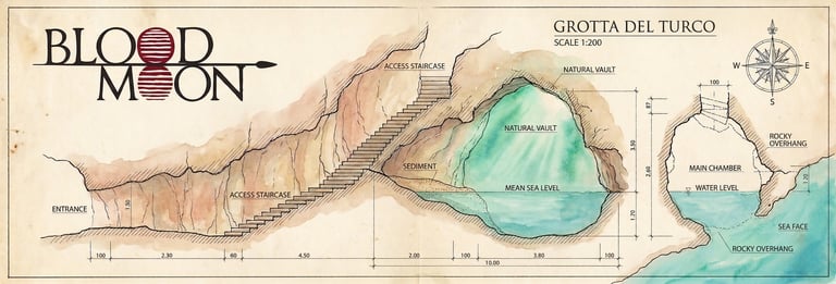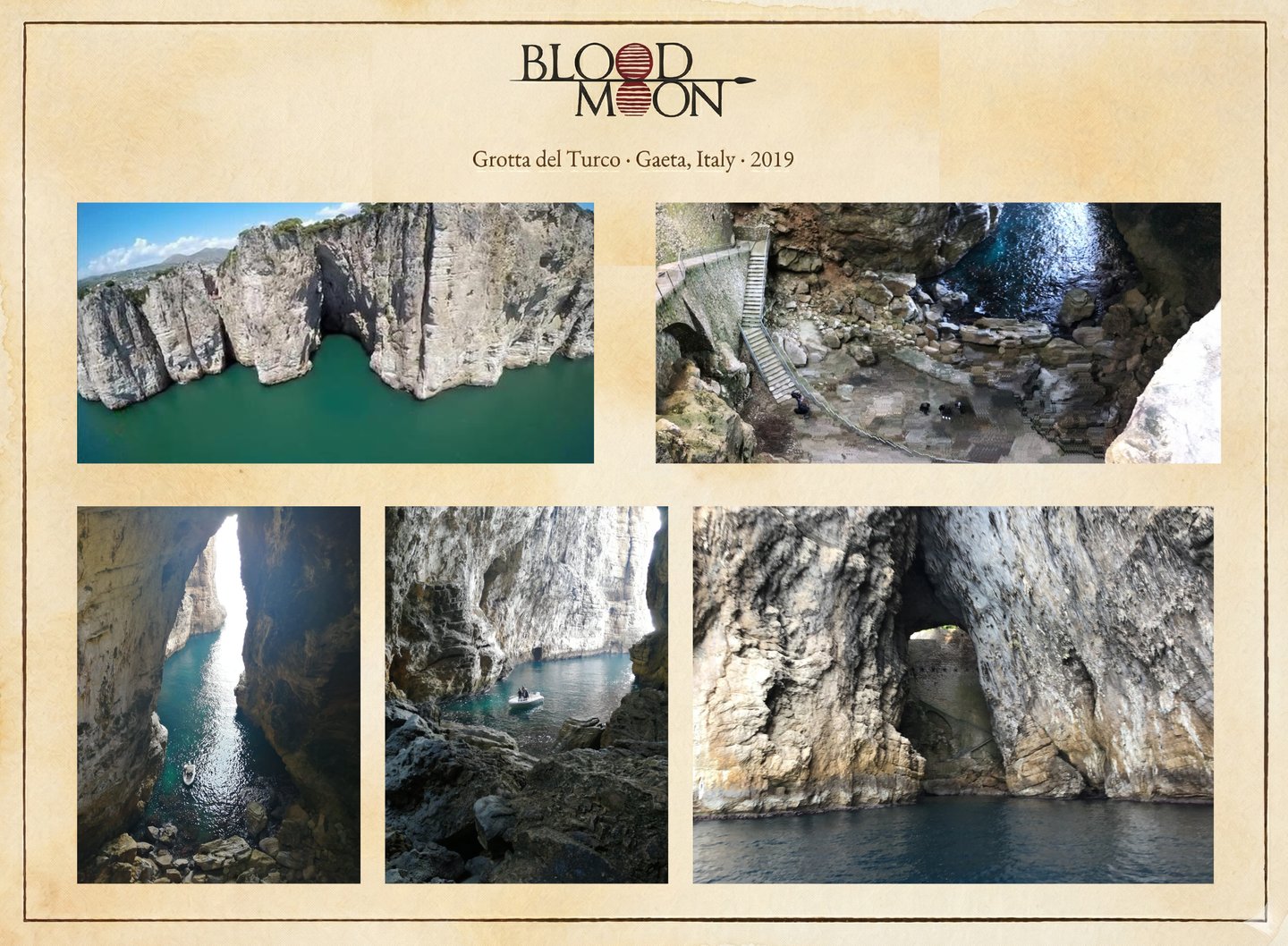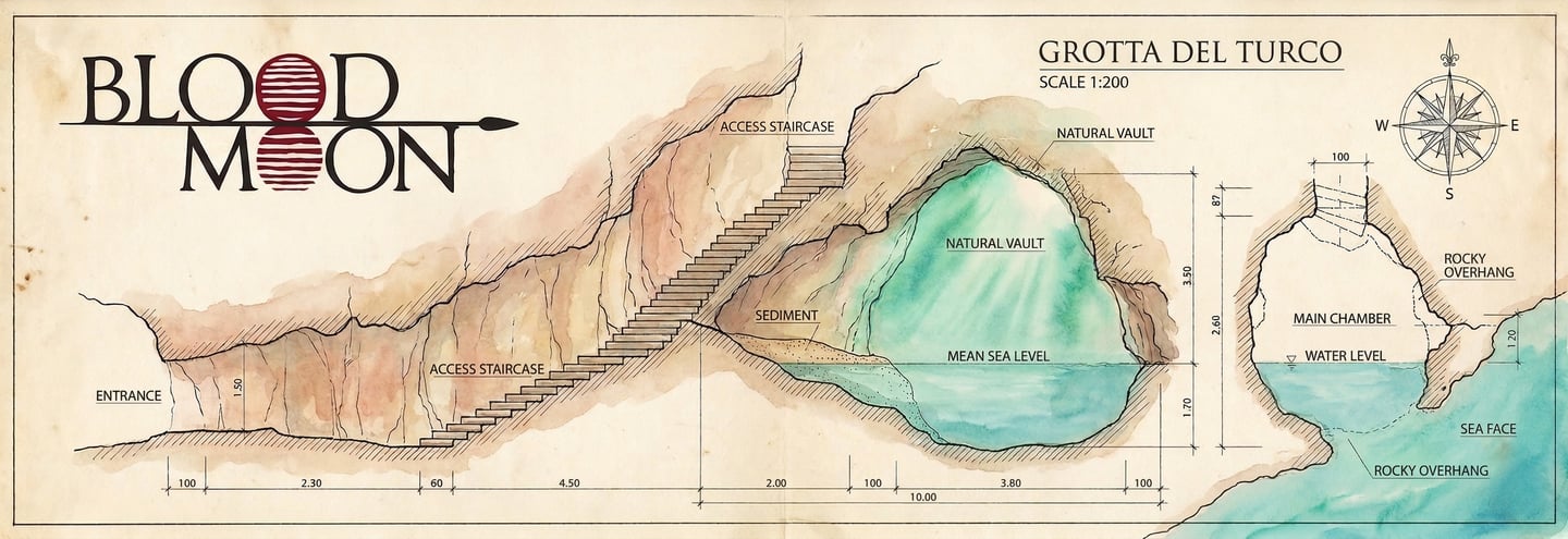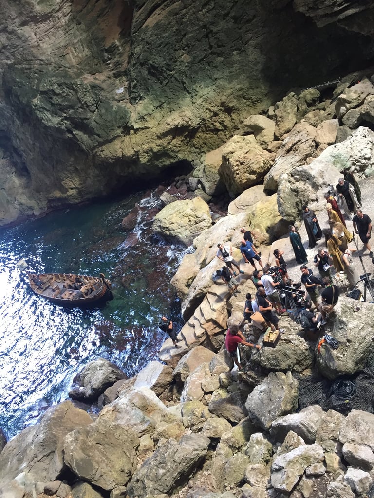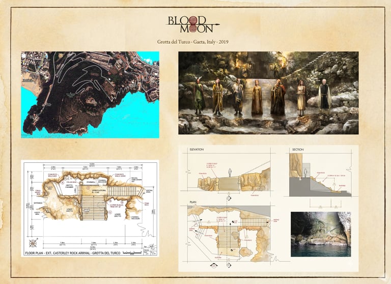 The Italian shoot centred on the Grotta del Turco in Gaeta — a spectacular natural sea cave accessible only by descending five to six hundred steps. Inside, a monumental stone staircase and a ship's landing dock were constructed in four weeks.