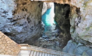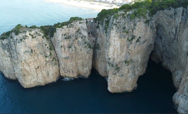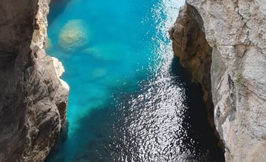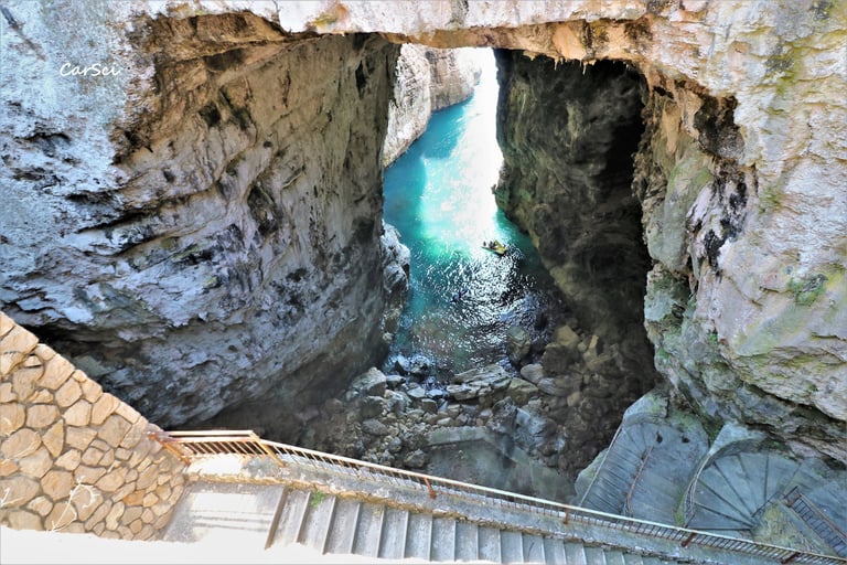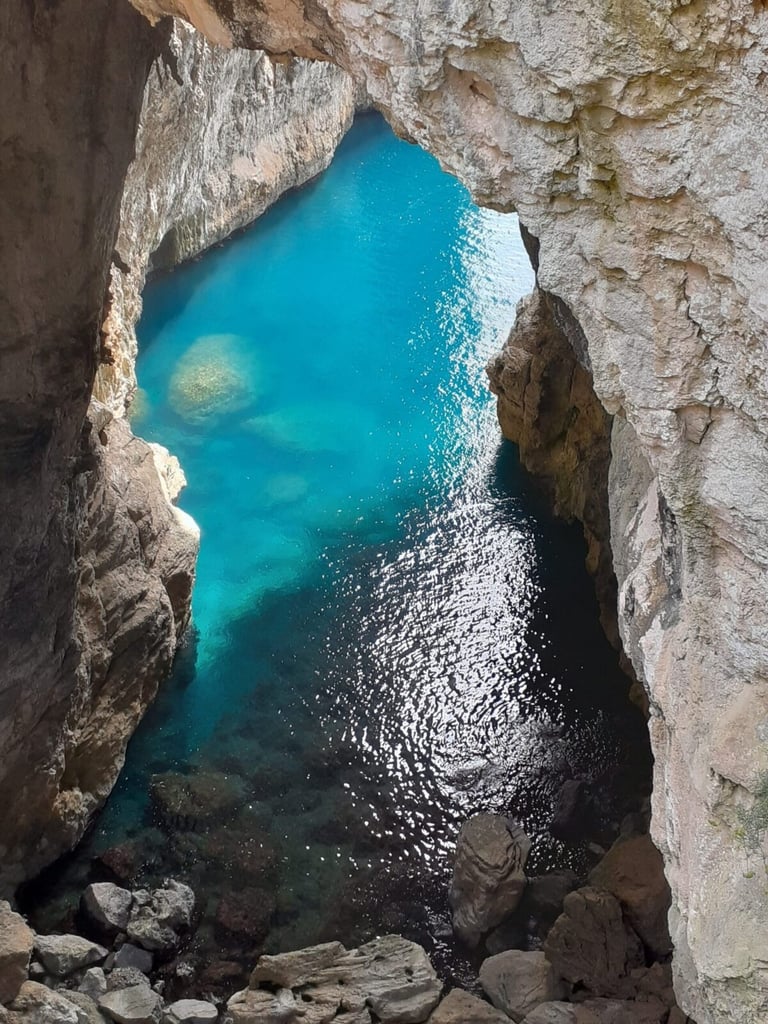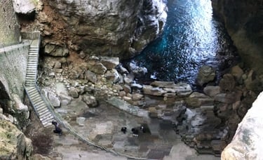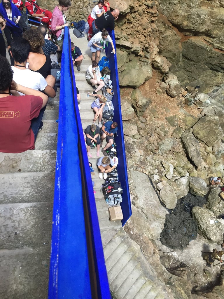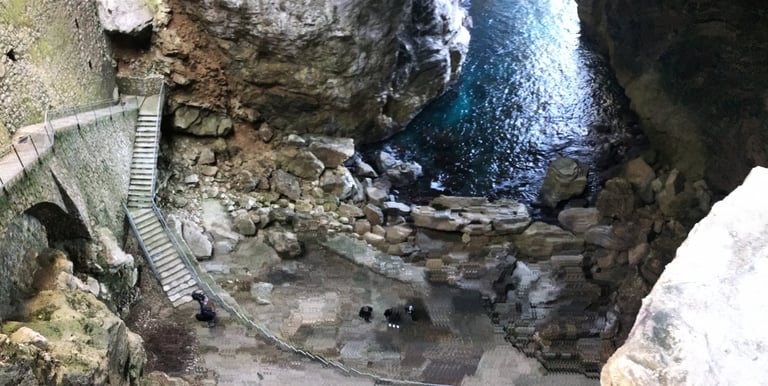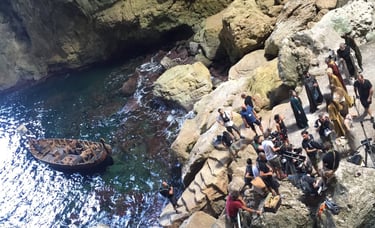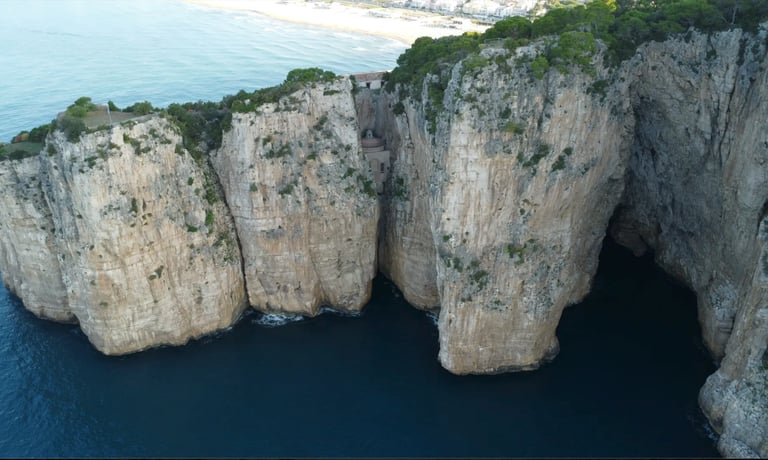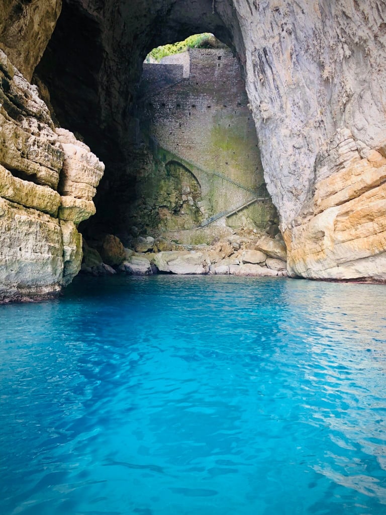 The Italian shoot centred on the Grotta del Turco in Gaeta — a spectacular natural sea cave accessible only by descending five to six hundred steps. Inside, a monumental stone staircase and a ship's landing dock were constructed in four weeks.