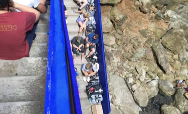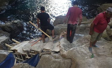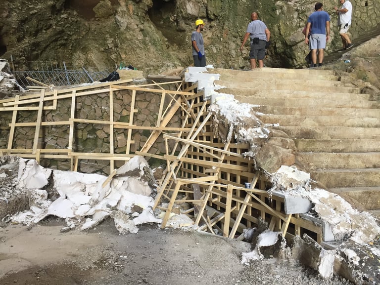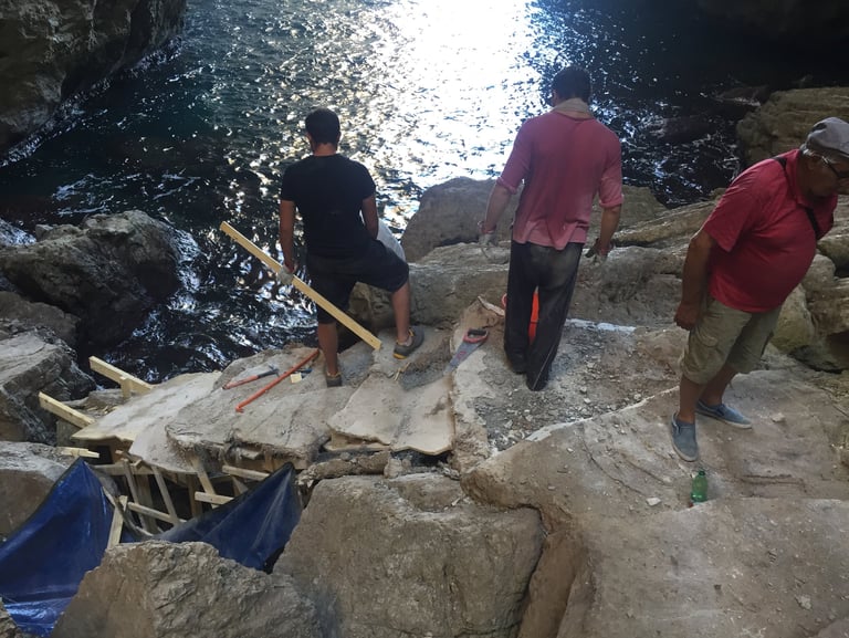 Every piece of material had to be carried down by hand — no cranes, no heavy machinery could reach the site. A custom rigging system devised by key craftsman Luigi Sergiani lowered and raised everything piece by piece.