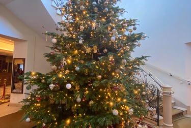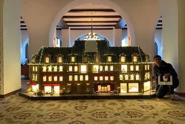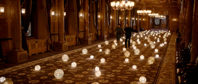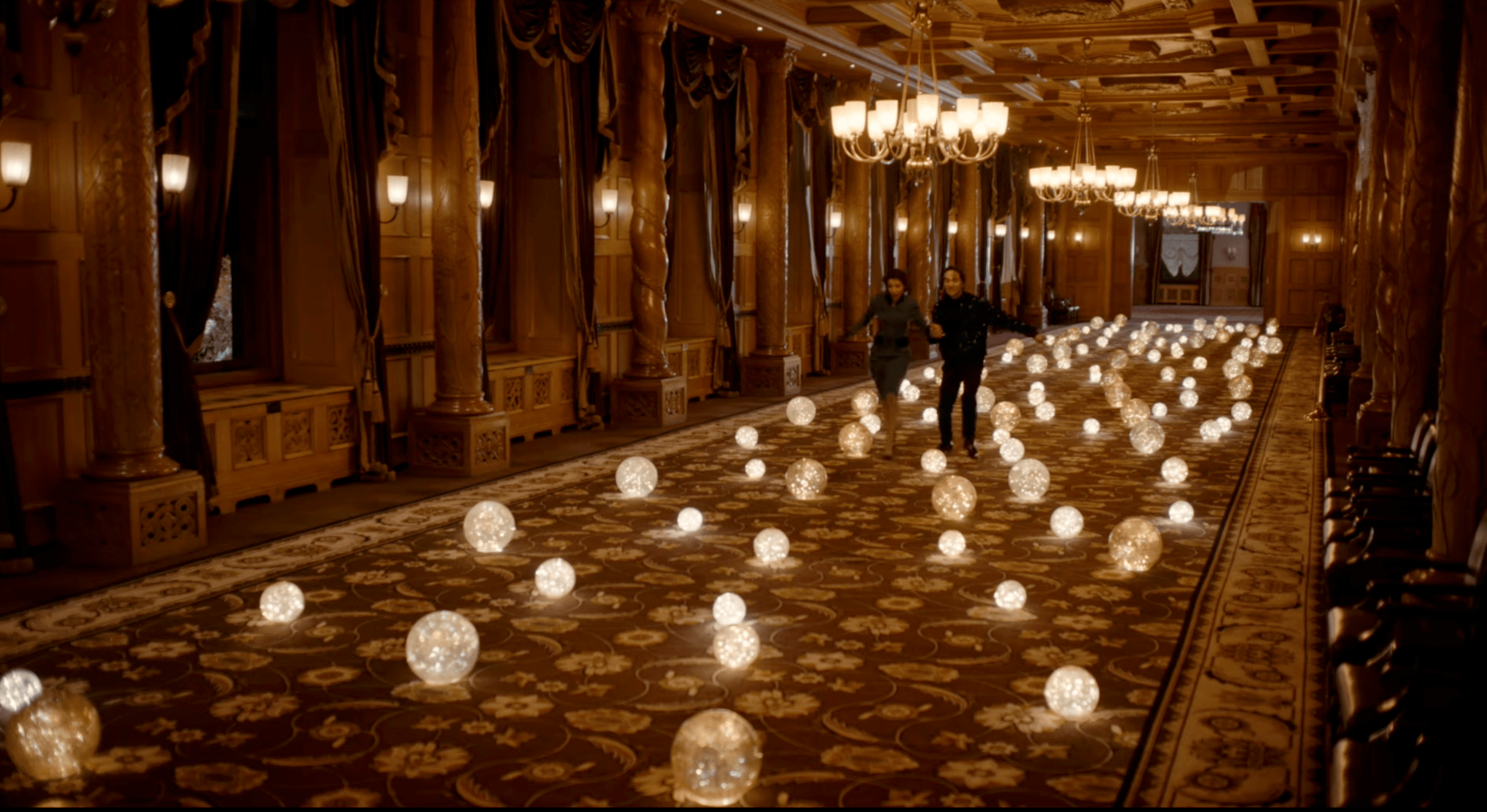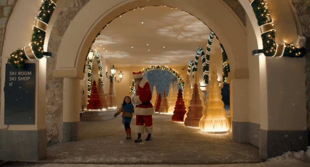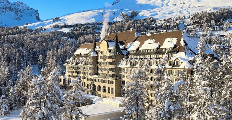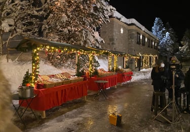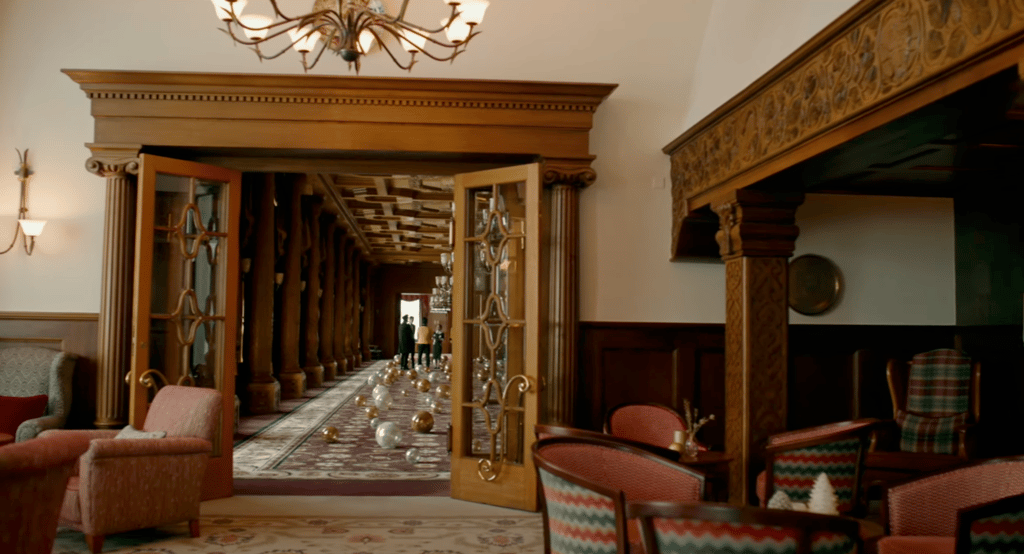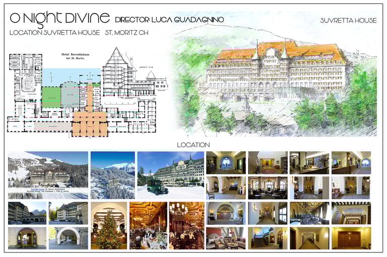 The entire Suvretta House — one of the great grand hotels of the Swiss Alps — was dressed from scratch for Christmas. Every corridor, salon and common space transformed into a festive world, with decorations, trees and objects supplied by Zara. As Production Designer, Romolo Pompa coordinated the complete scenic dressing of the hotel across all floors and spaces.