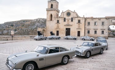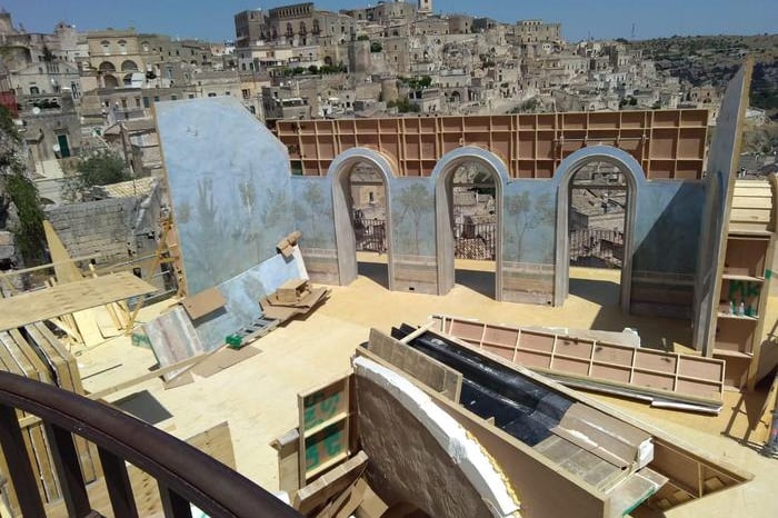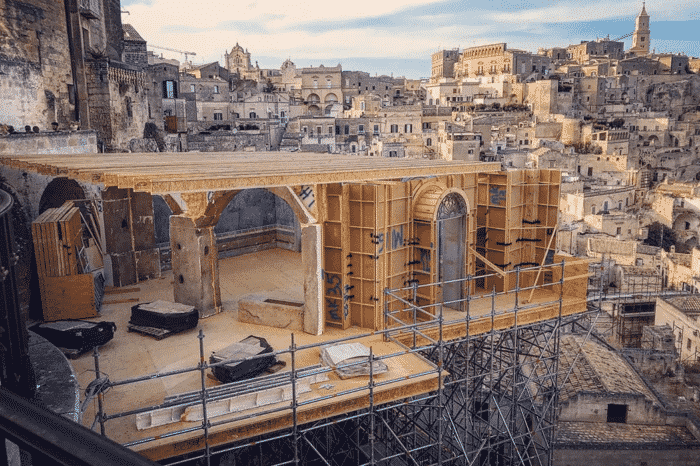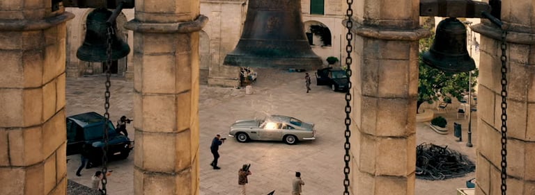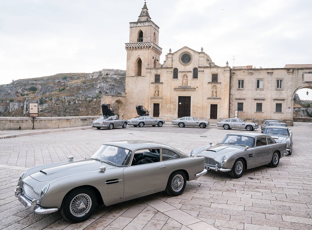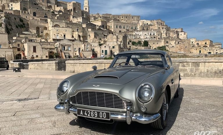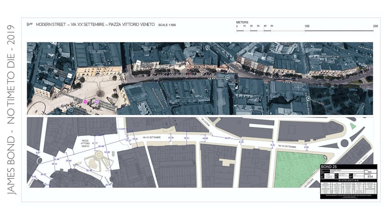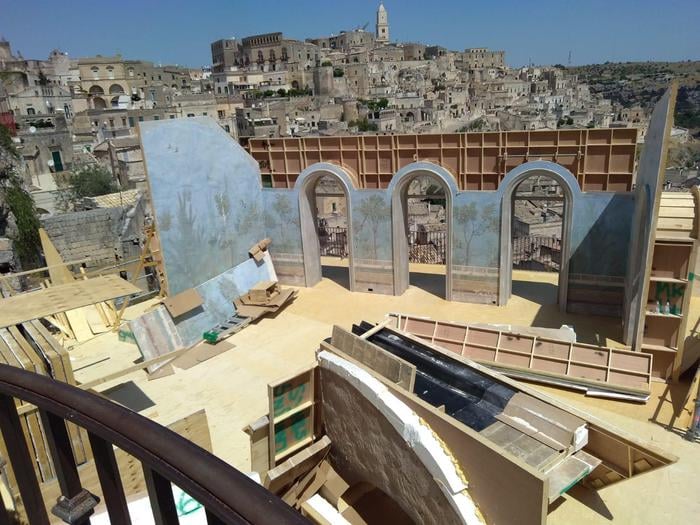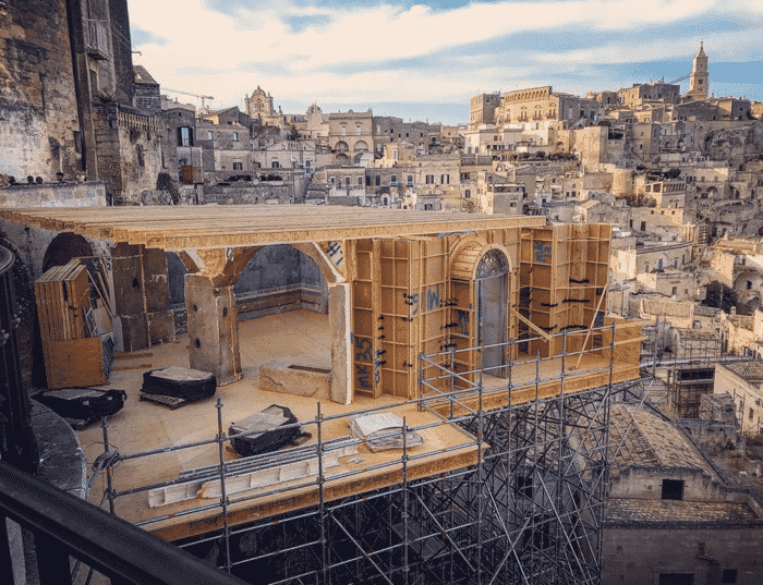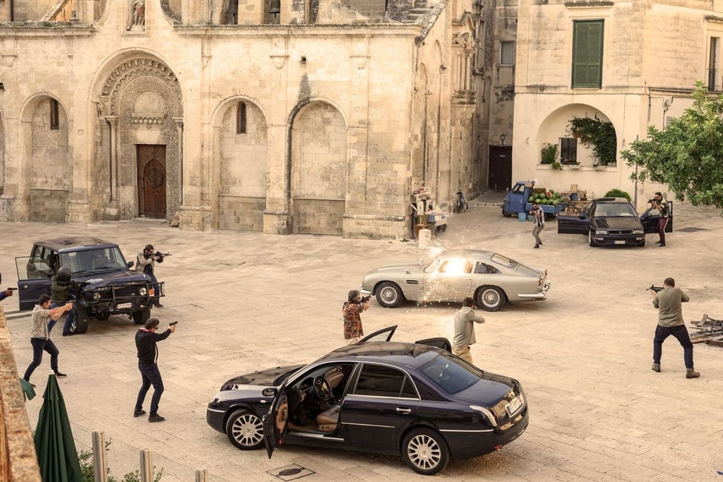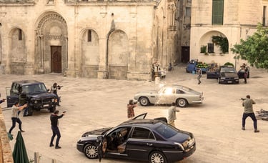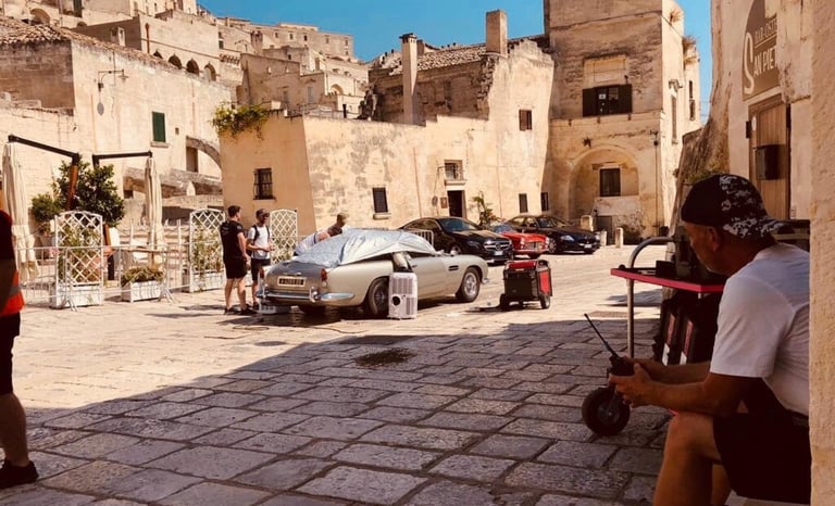 Matera was transformed into one of the most complex open-air sets in Bond history. Every door, window and architectural element in the city centre was replaced with scenographic versions. Ramps were built for motorcycle stunts. The streets of Matera were then reconstructed at 1:1 scale on an abandoned airstrip — sections up to five hundred metres long — so stunt drivers could rehearse every sequence before filming in the city itself.