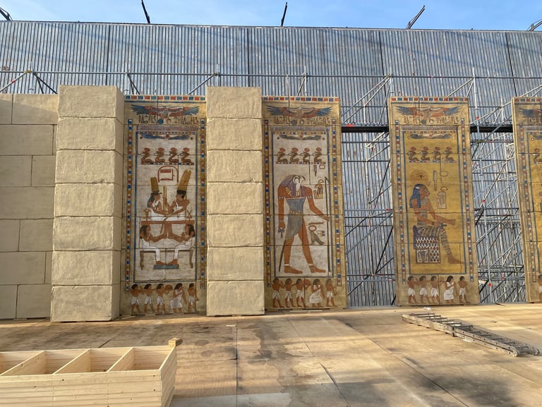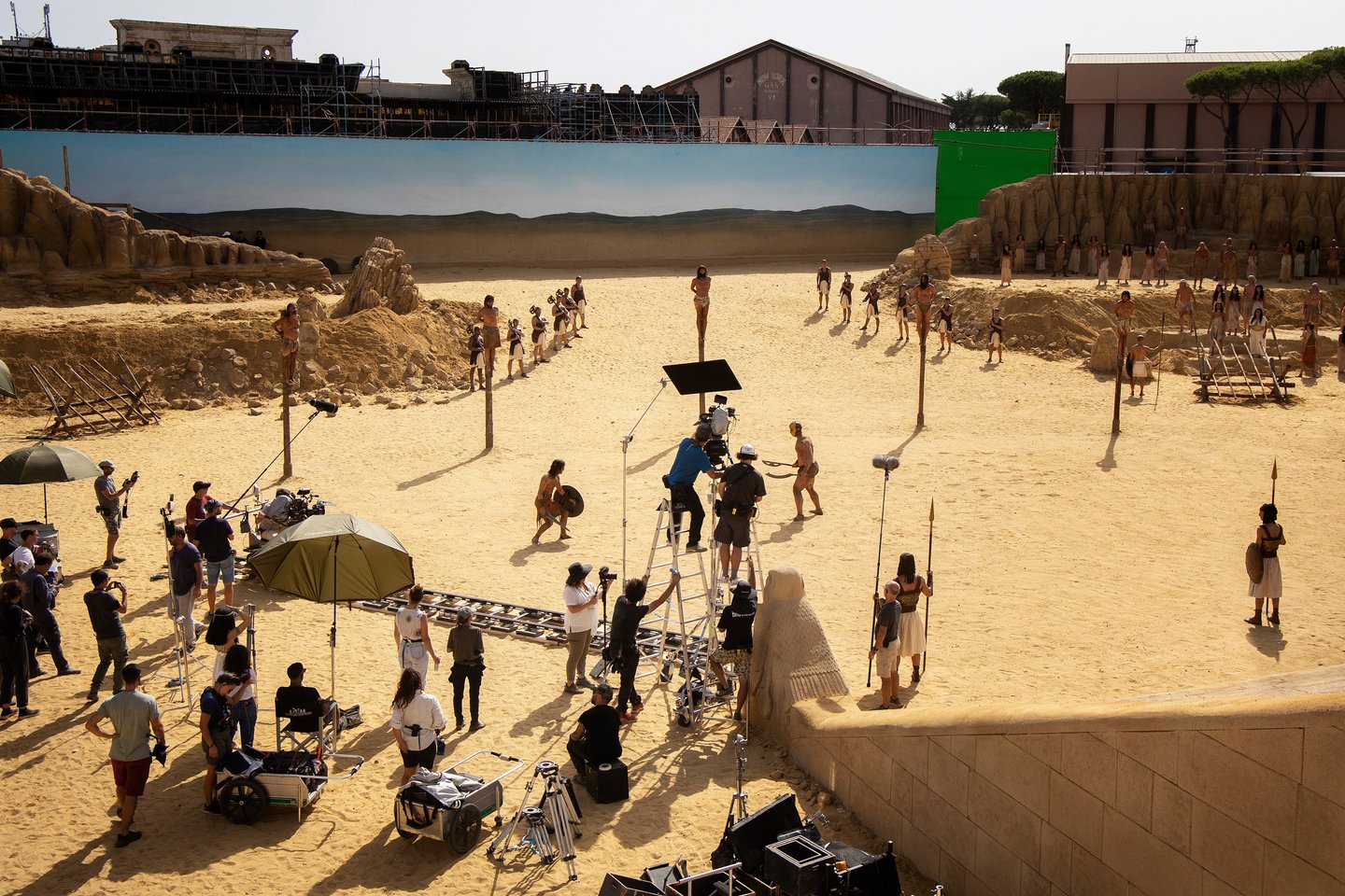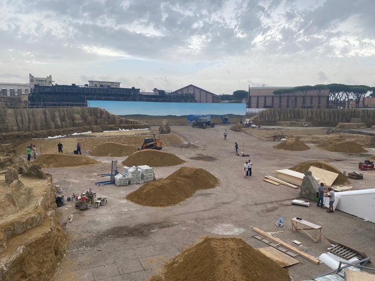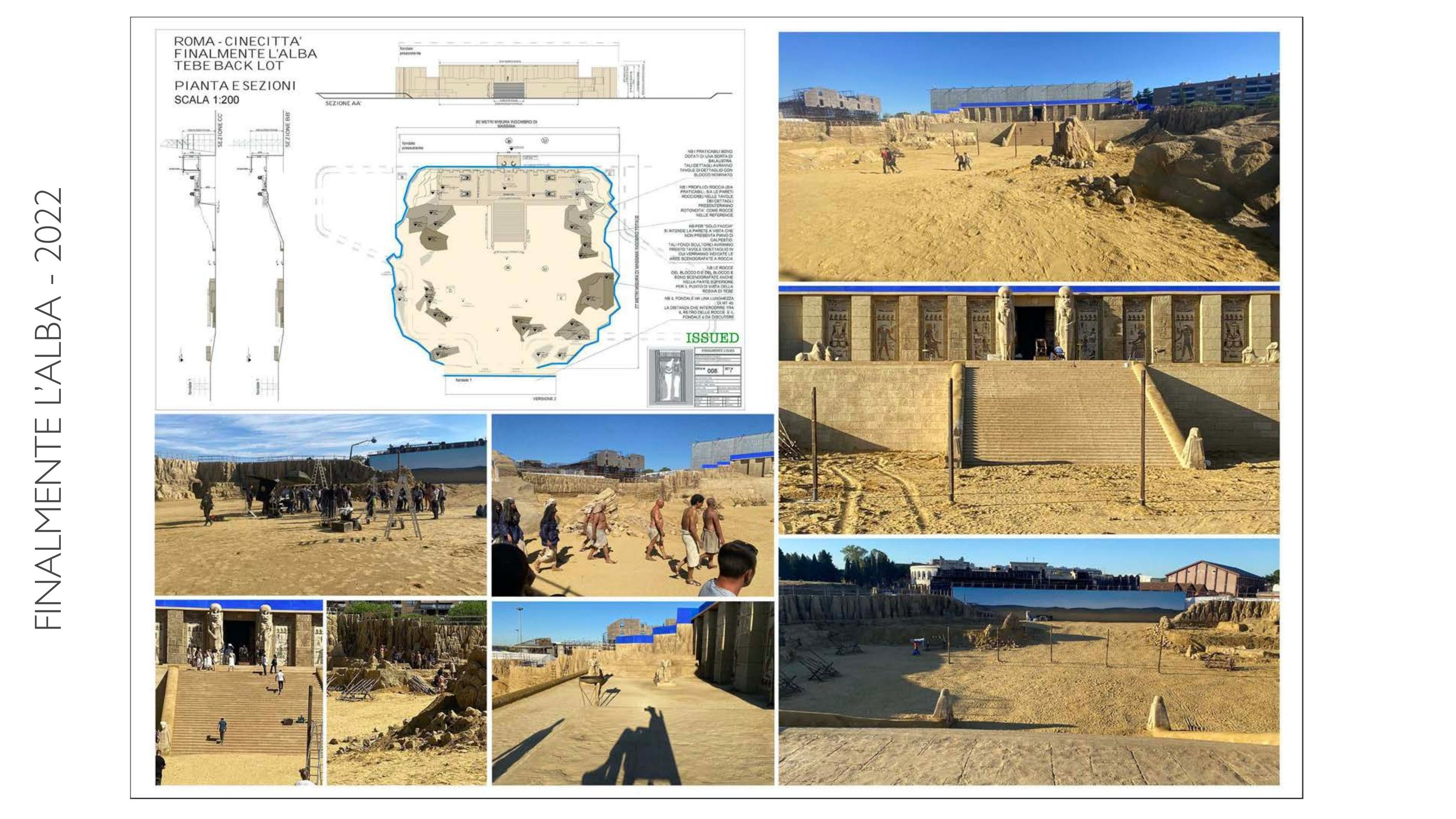 One of the most ambitious Italian film sets in recent years. Two distinct worlds were built: post-war Rome reconstructed in exterior locations, and the Cinecittà studios of the 1950s where a full Egyptian peplum epic was shot within the film. The centrepiece was the Temple of Thebes — eleven weeks of construction, a sixty-metre palace flanked by sculpted rock walls, a monumental staircase decorated with hieroglyphics, earth and sand covering the ground. The rocks were built on wooden walkways clad in polystyrene, worked with acetone to reproduce ancient weathered stone.