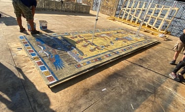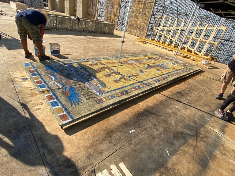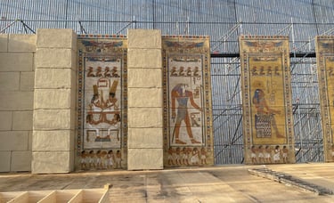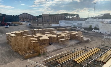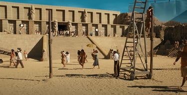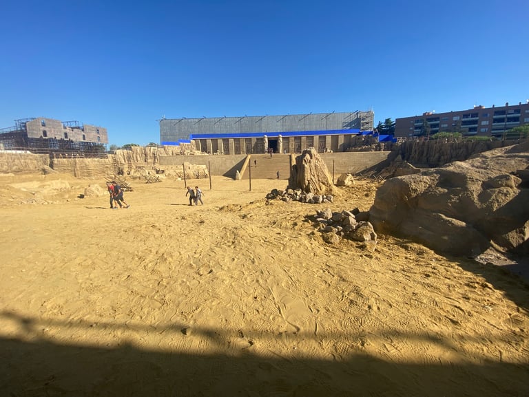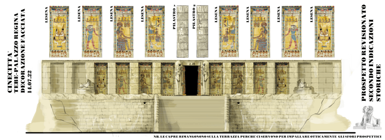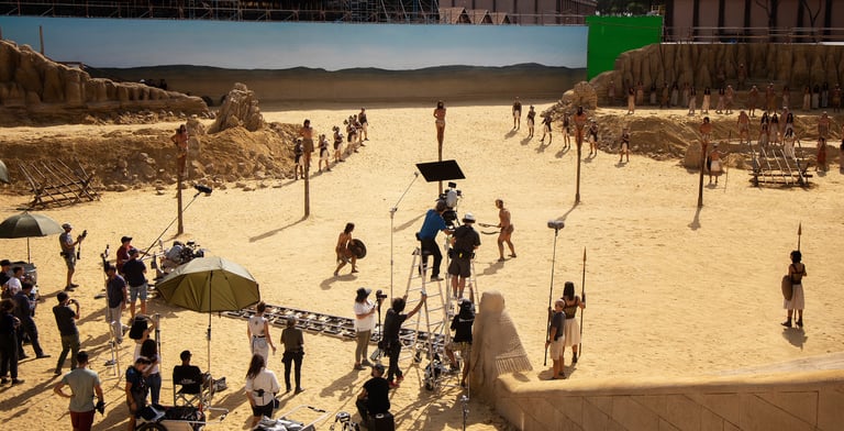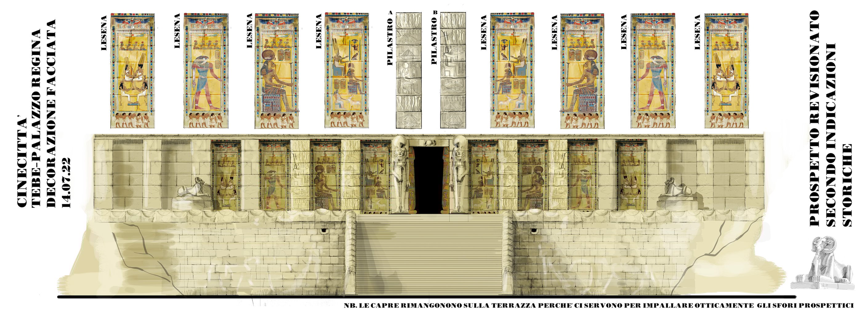 One of the most ambitious Italian film sets in recent years. Two distinct worlds were built: post-war Rome reconstructed in exterior locations, and the Cinecittà studios of the 1950s where a full Egyptian peplum epic was shot within the film. The centrepiece was the Temple of Thebes — eleven weeks of construction, a sixty-metre palace flanked by sculpted rock walls, a monumental staircase decorated with hieroglyphics, earth and sand covering the ground. The rocks were built on wooden walkways clad in polystyrene, worked with acetone to reproduce ancient weathered stone.