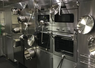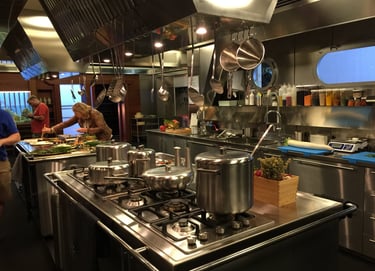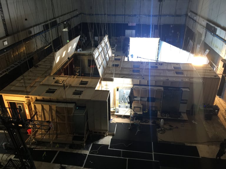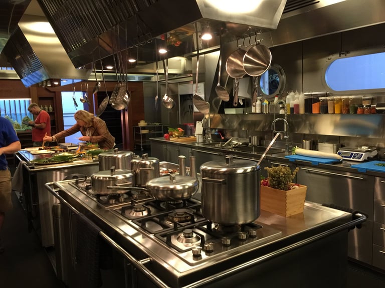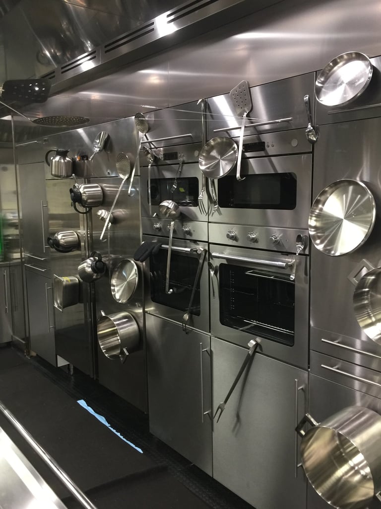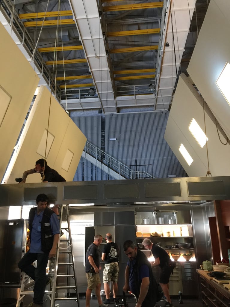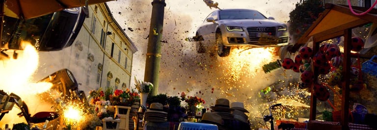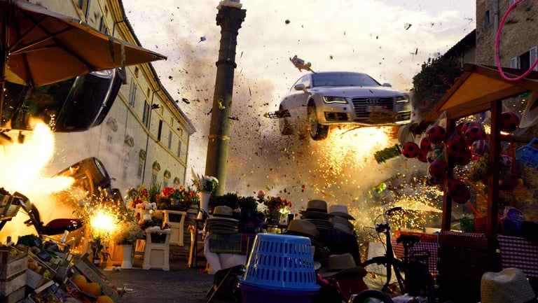 The production turned Rome, Florence and Siena upside down with high-speed car chases. Thecentrepiece set at Cinecittà was the Galley Kitchen — a fully magnetic ship's kitchen where a giant magnetsends every knife and metal object flying across the room. Every blade was rigged with invisible wire threaded through the furniture. The set also featured movable ceilings — surgically opened and closed around every shot.